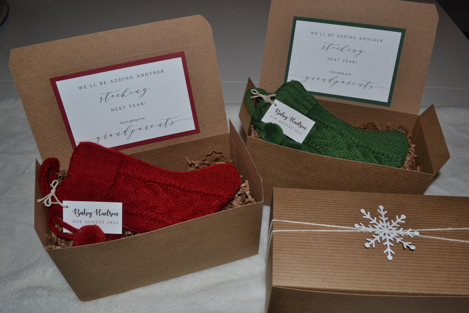 Have friends and family unwrap this memorable gift that will reveal your sweet pregnancy news!! You’ll be shipped a little box with a customizable message and stocking inside. You can choose from red or green!