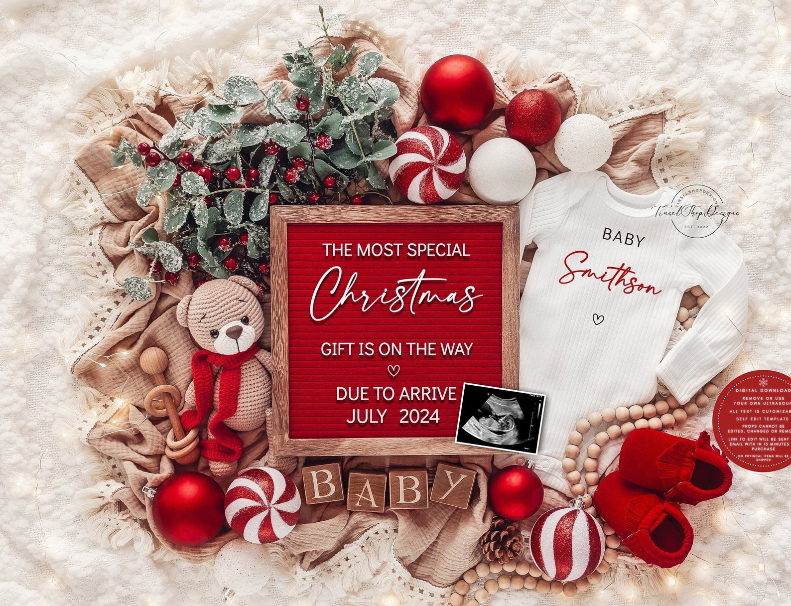 The last digital pregnancy announcement option of the post, and this one is all out Christmas themed! Bright red and beautiful. You will need to customize this one yourself.